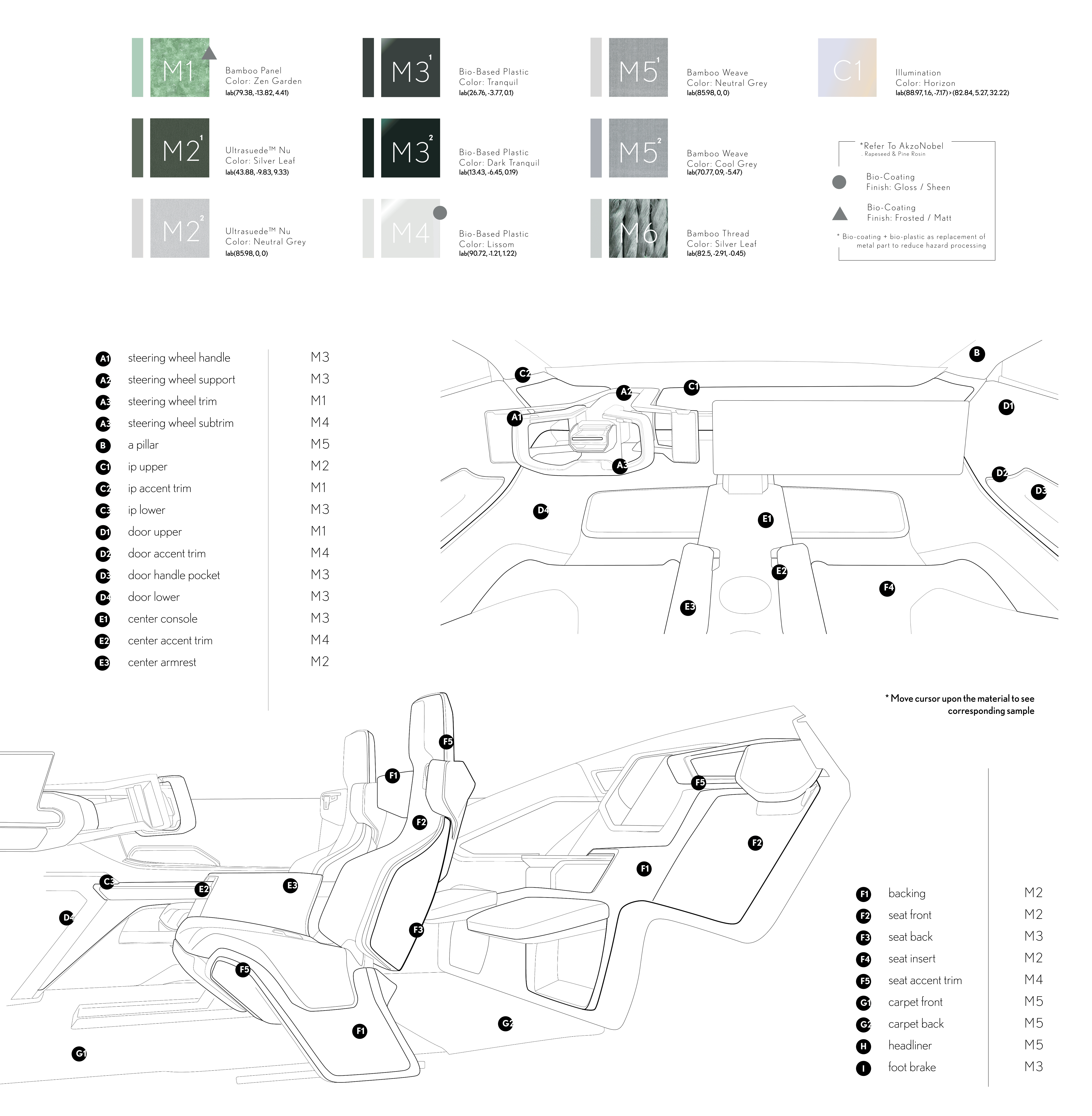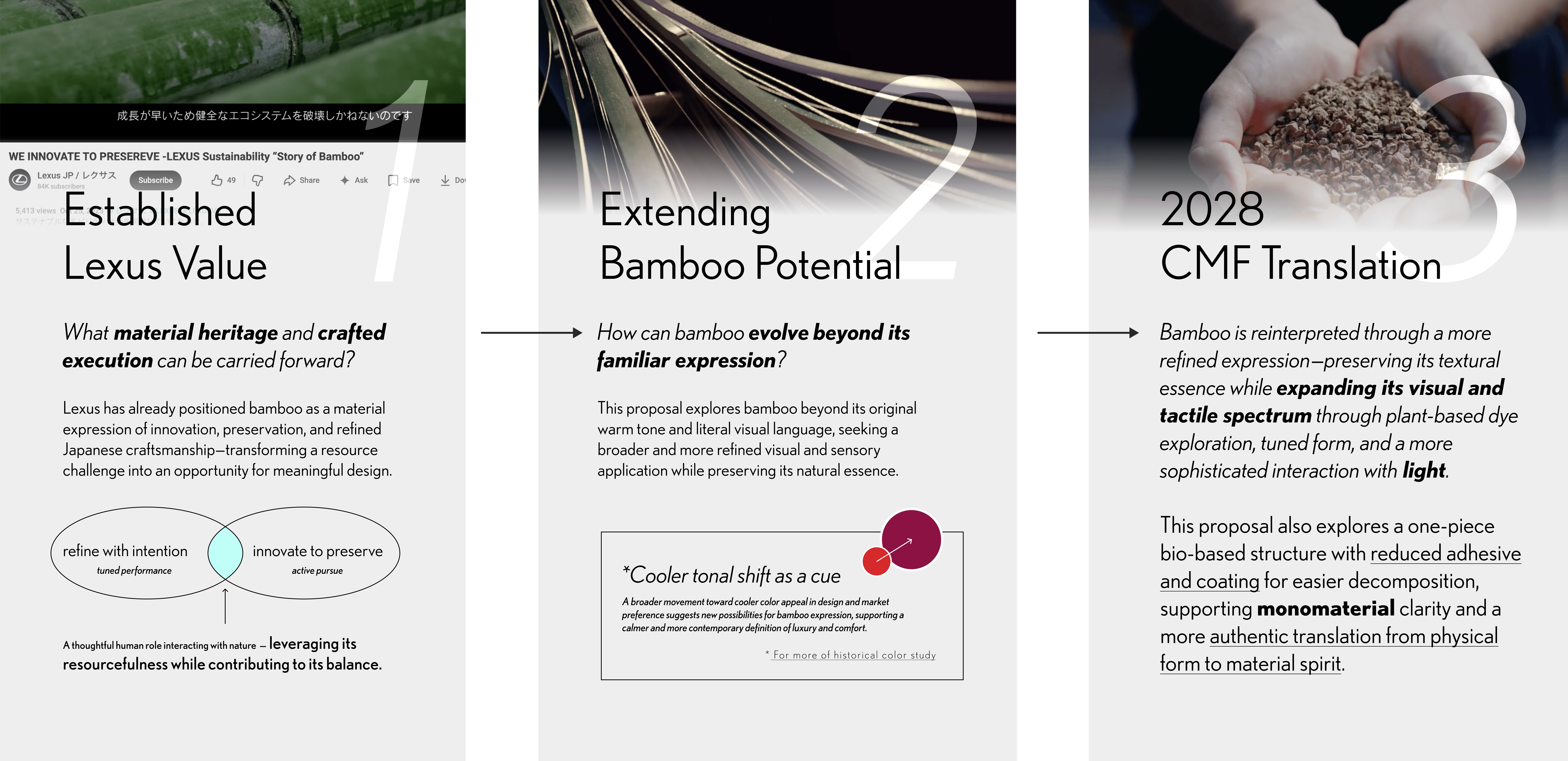 A tailored CMF proposal for Lexus LF-ZL 2028, reinterpreting bamboo through expanded tonal, tactile, and light-responsive expression, monomaterial-oriented construction, and a more authentic translation of its material spirit.
